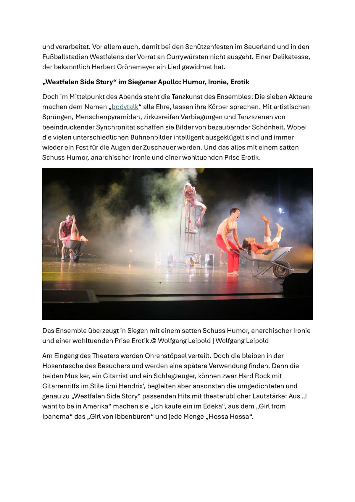 Hinreißend gelingt eine Parodie auf das „America“ der West Side Story, da sich ja der Songtitel auch auf den Namen eines großen Lebensmittelhändlers reimt und Bodytalk dessen große Motivation in der Fleischherstellung fachgerecht und facettenreich besingt. Schließlich darf ein Zuschauer entscheiden, wie die Tänzerin Amy Pender zu Wurst verarbeitet wird, bloß damit schließlich das gesamte Ensemble in Wurstnetze gehüllt über die Bühne springt. Besonders augenfällig ist der tänzerische Neuzugang Kenji Shinohe, der nicht nur äußerst gewandt und sich für Bodytalk ungewohnt grazil über die Bühne bewegt und zudem mit seinem Grimassieren besonders die komischen Parts ungemein bereichert.