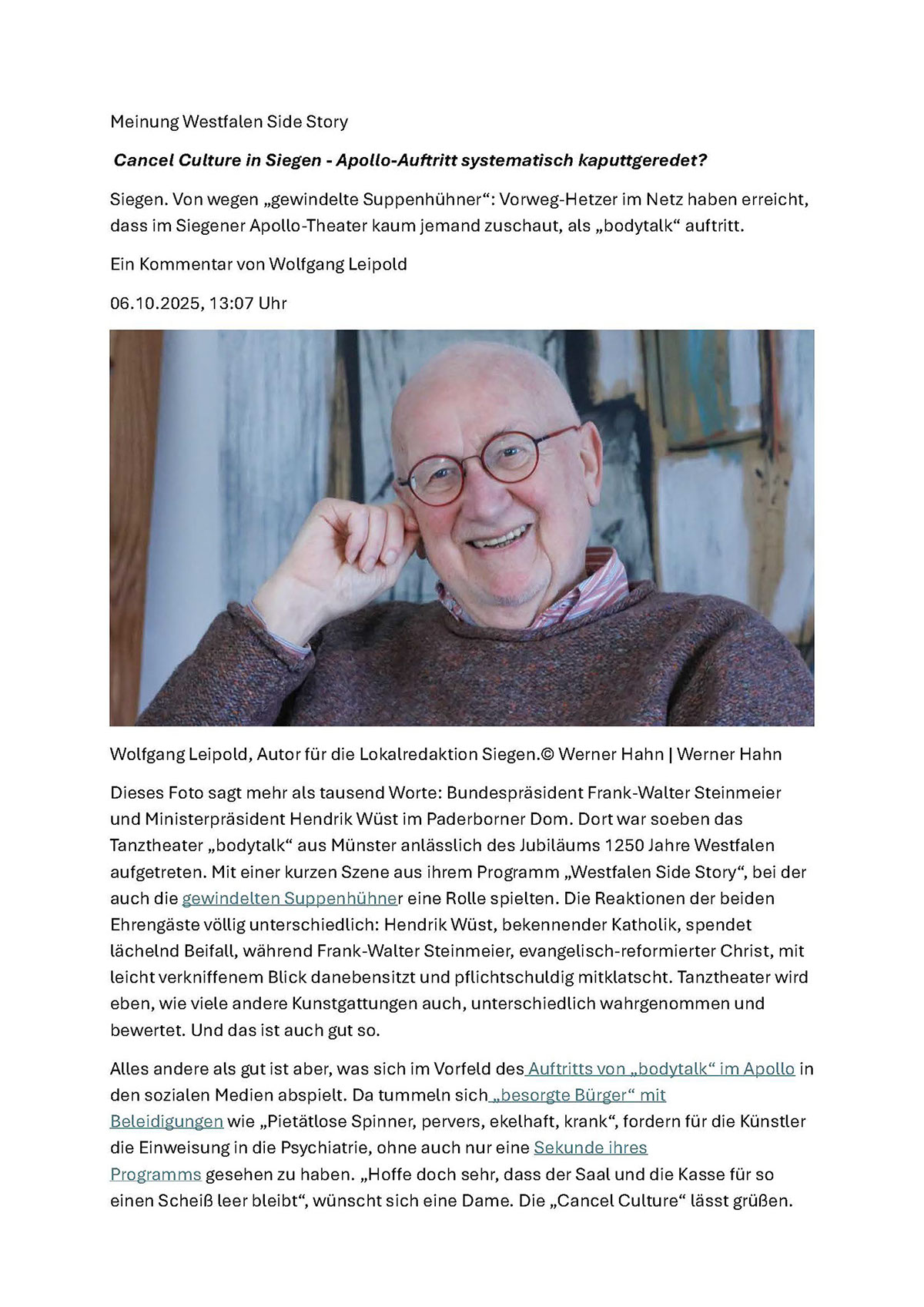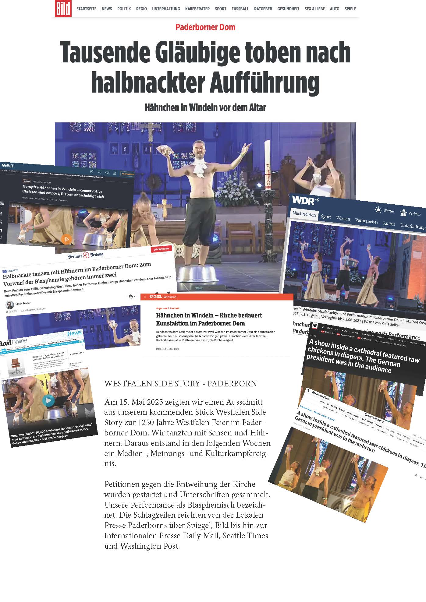 Das Stück hatte im Mai mit einem kleinen Ausschnitt im Paderborner Dom von uns unbeabsichtigt einen viel beachteten Skandal ausgelöst – und eine bundesweite Diskussion über künstlerische Freiheit angestoßen. Darüber berichteten unter anderem The Washington Post, Neue Zürcher Zeitung, Der Spiegel und Bild.