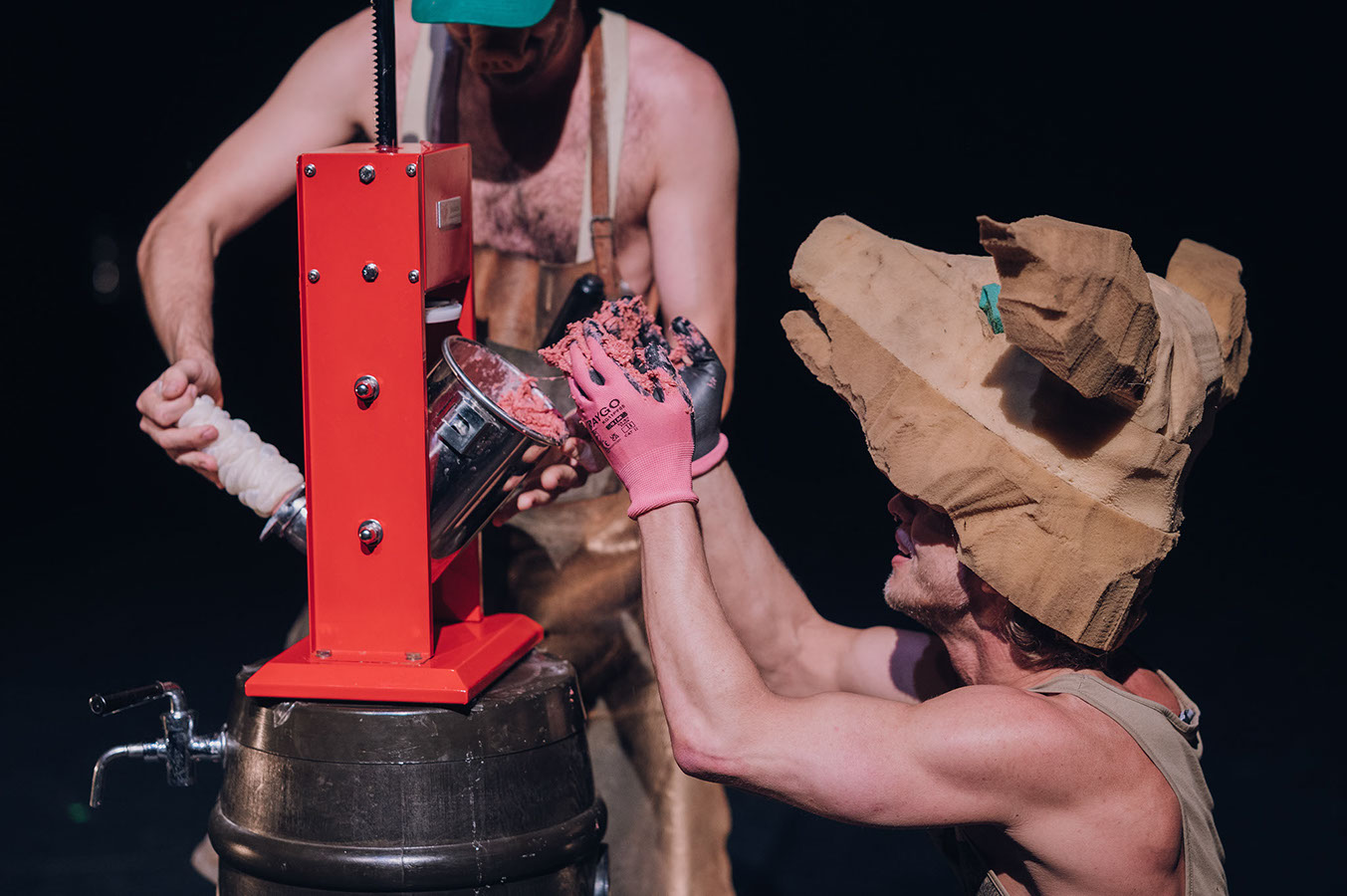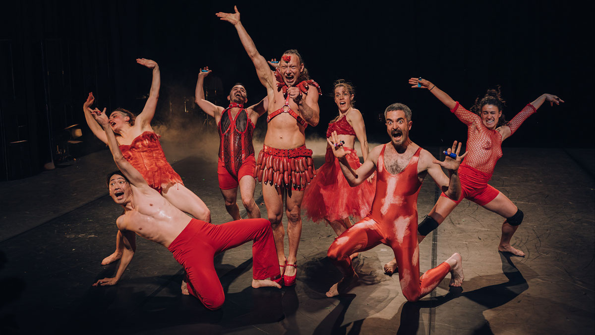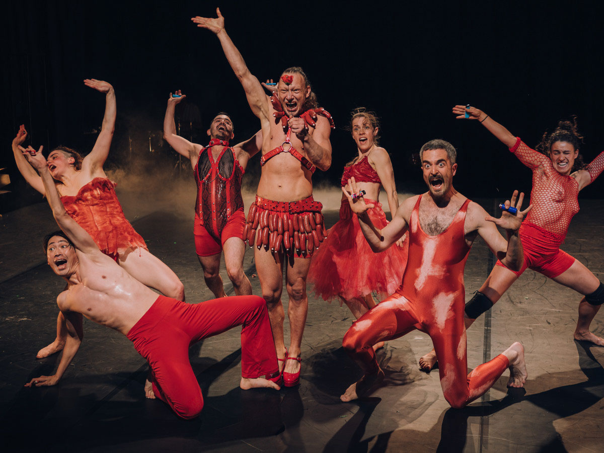 Dabei steht doch eigentlich das Schweine-Wurst-Land im Vordergrund. Etwa in Form der Wurstmaschine, wo das Publikum Zeuge einer Live-Wurstproduktion wird, die einem Performer mit Schweinekopf galgengleich, um den Hals gewickelt wird. Maskenköpfe und Menschenkörper werden mit Schinkenscheiben belebt, ein roter Wurstgott tritt in einer an brasilianischen Karneval erinnernden Beschwörungsnummer auf, die abgeschlossen wird von einem japanischen Reigentanz. Es gibt die angedeutete Ausweidung eines Schweines mit Herz, Darm und Eingeweiden, und unter dem pendelnden Herz taucht schließlich Tirza Ben Zvi ab. Drastisches kombiniert sich mit Lustigem, Visuelles mit Olfaktorischen. Bodytalk ist hier ganz bei sich und lässt Tanzende wie auch das Publikum kaum zu Atem kommen, angesichts der auf alle ballernden Bilder und den daraus folgenden Assoziationstsunamis.
