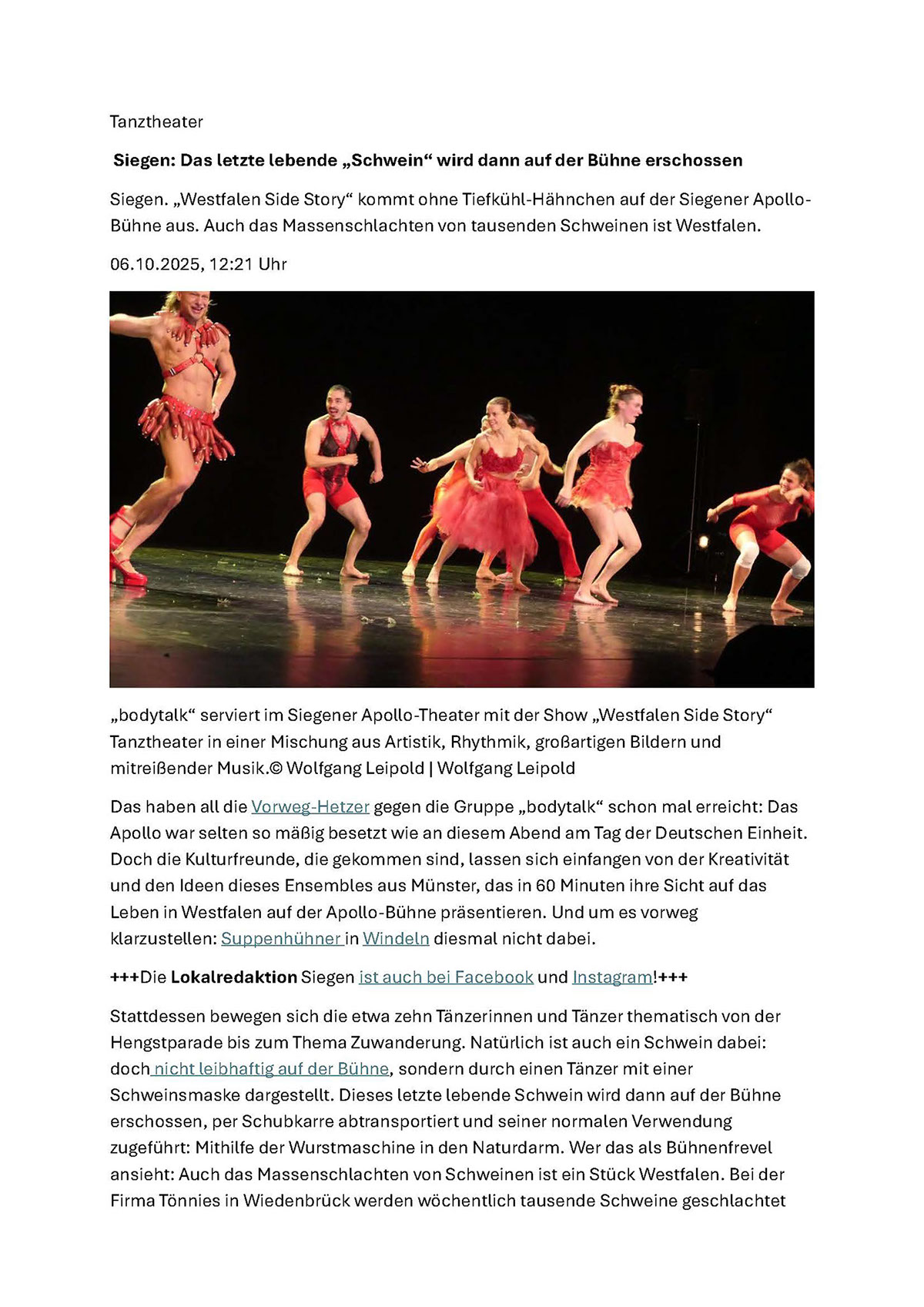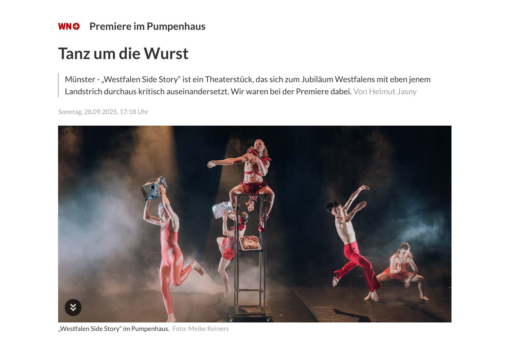 Zugleich ist es einer der ruhigeren Momente dieser „Westfalen Side Story“, die Bodytalk zusammen mit der japanischen Choreografin und Tänzerin Reisa Shimojima erarbeitet hat. Yoshiko Waki, neben Rolf Baumgart Gründerin von Bodytalk, hatte Shimojima bei einem Festival in Japan kennengelernt und nach Münster eingeladen. Shimojima hat bereits internationale Erfahrungen in Taiwan und Korea gesammelt, aber das wurstlastige Westfalen ist dann doch eine Herausforderung. Zusammen mit der Bühnen- und Kostümbildnerin Nanako Oizumi bilden sie ein japanisches Dreiergespann, das nun diesen Abend im Rahmen des Jubliäums 1250 Jahre Westfalen präsentieren. Bereits zum offiziellen Festakt im Dom von Paderborn waren sie mit dabei, und ihr Beitrag mit tanzenden Hühnchen in Windeln vor dem Altar produzierte einen veritablen Shitstorm. Daher geht es diesmal nicht um Hühnchen, sondern primär um's Schwein und die Würste, die man daraus machen kann.