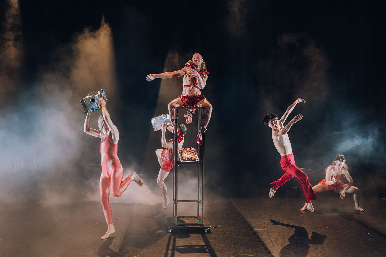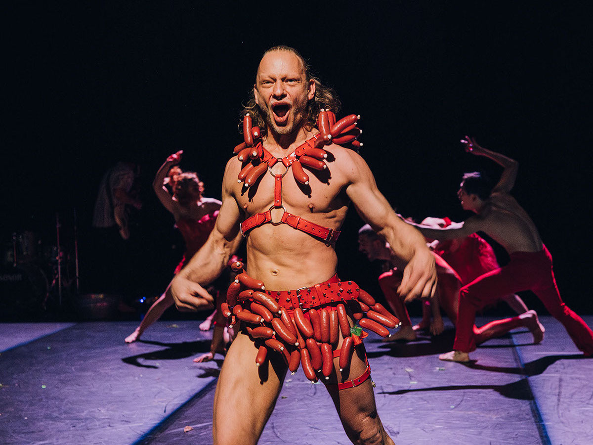 Dabei steht doch eigentlich das Schweine-Wurst-Land im Vordergrund. Etwa in Form der Wurstmaschine, wo das Publikum Zeuge einer Live-Wurstproduktion wird, die einem Performer mit Schweinekopf galgengleich, um den Hals gewickelt wird. Maskenköpfe und Menschenkörper werden mit Schinkenscheiben belebt, ein roter Wurstgott tritt in einer an brasilianischen Karneval erinnernden Beschwörungsnummer auf, die abgeschlossen wird von einem japanischen Reigentanz. Es gibt die angedeutete Ausweidung eines Schweines mit Herz, Darm und Eingeweiden, und unter dem pendelnden Herz taucht schließlich Tirza Ben Zvi ab. Drastisches kombiniert sich mit Lustigem, Visuelles mit Olfaktorischen. Bodytalk ist hier ganz bei sich und lässt Tanzende wie auch das Publikum kaum zu Atem kommen, angesichts der auf alle ballernden Bilder und den daraus folgenden Assoziationstsunamis.